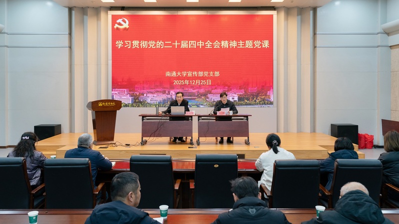 12月25日下午,校党委统战部、保卫部党支部联合宣传部党支部、医学院研究生党支部共同开展了深入学习贯彻党的二十届四中全会精神主题党课,党课由学习党的二十届四中全会精神南通市宣讲团成员、我校党委常委、副校长吉明明教授主讲,校党委常委、宣传部部长、统战部部长、保卫部部长朱城主持主题党课。